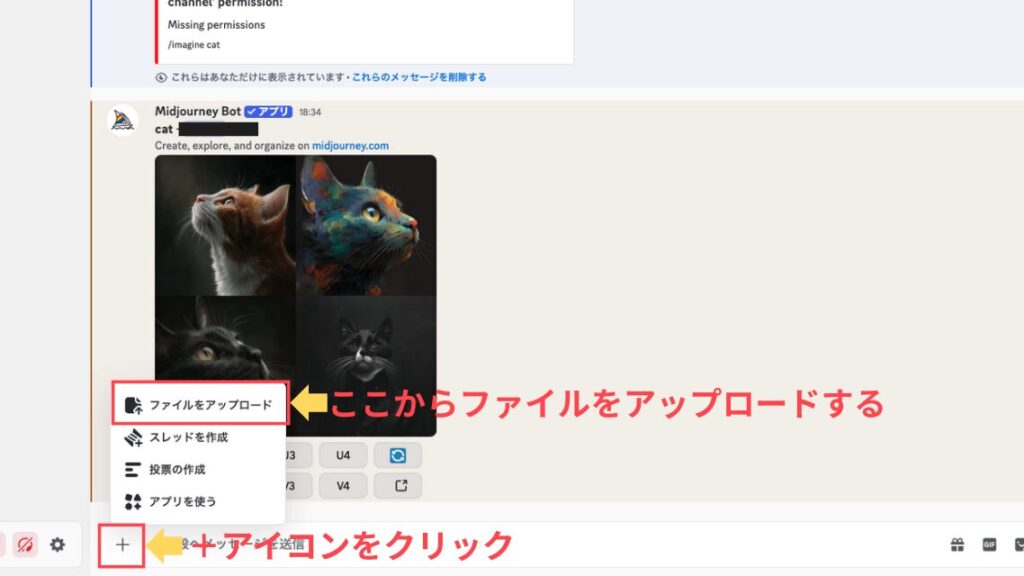 Discord版Midjourneyで、以下のいずれかの方法で画像をアップロードします。