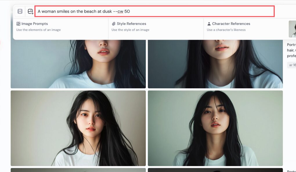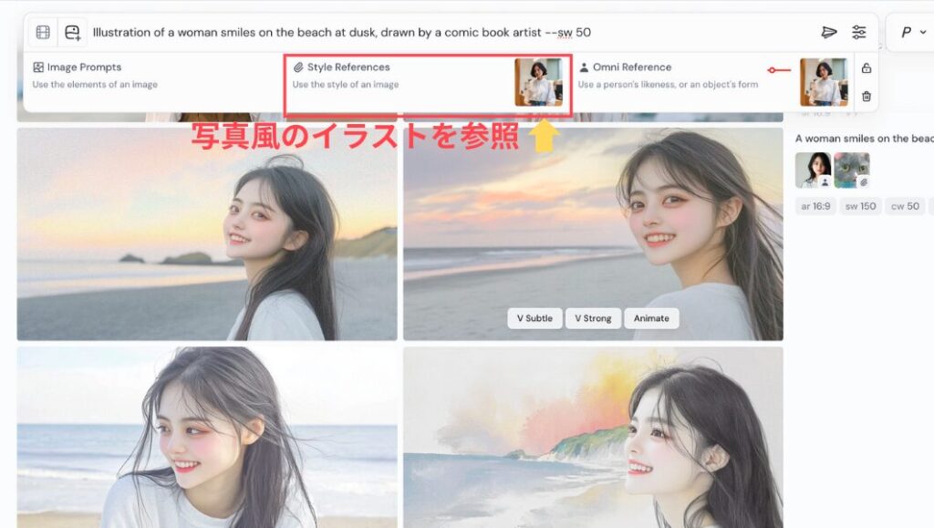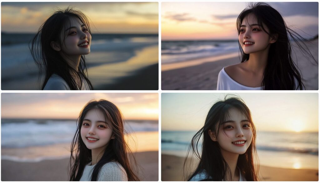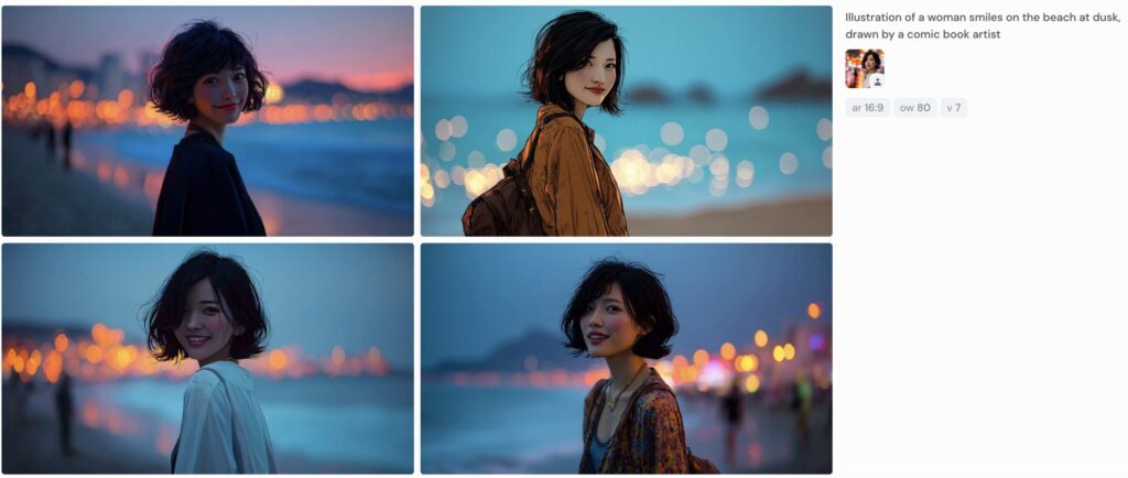 /imagine prompt: A woman smiles on the beach at dusk –oref [画像URL]