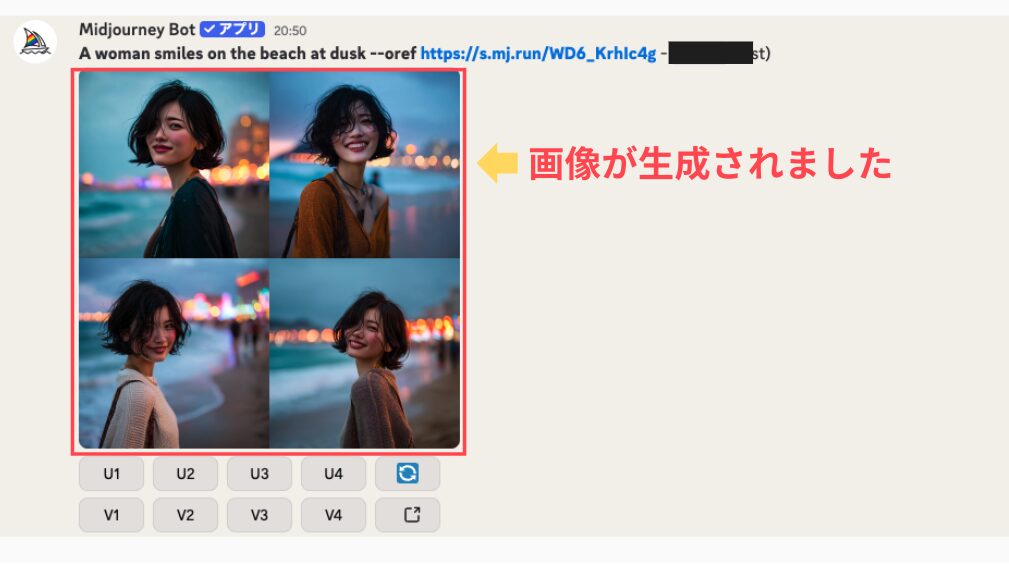 Discord版Midjourneyで同じキャラを作成する流れは以下です。