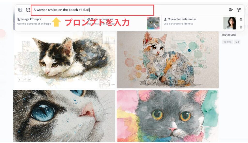 今回は「A woman smiles on the beach at dusk(女性が夕暮れのビーチで笑顔を見せている)」と入力します。