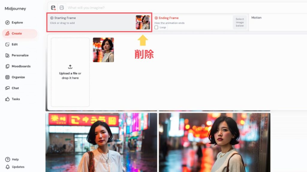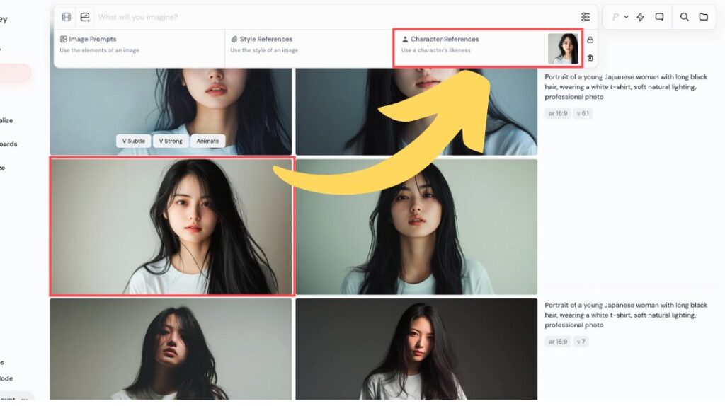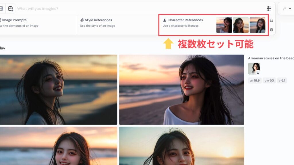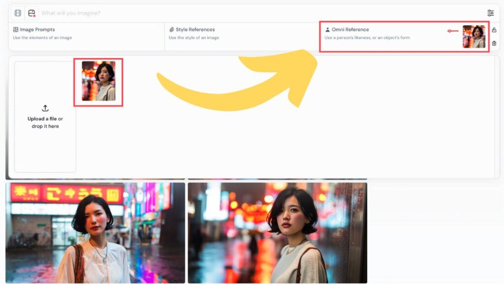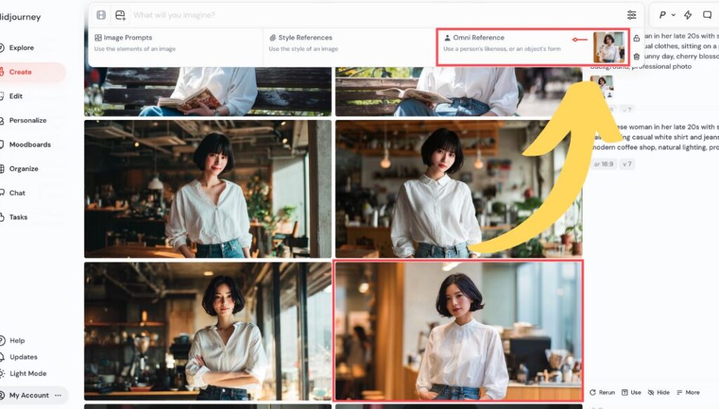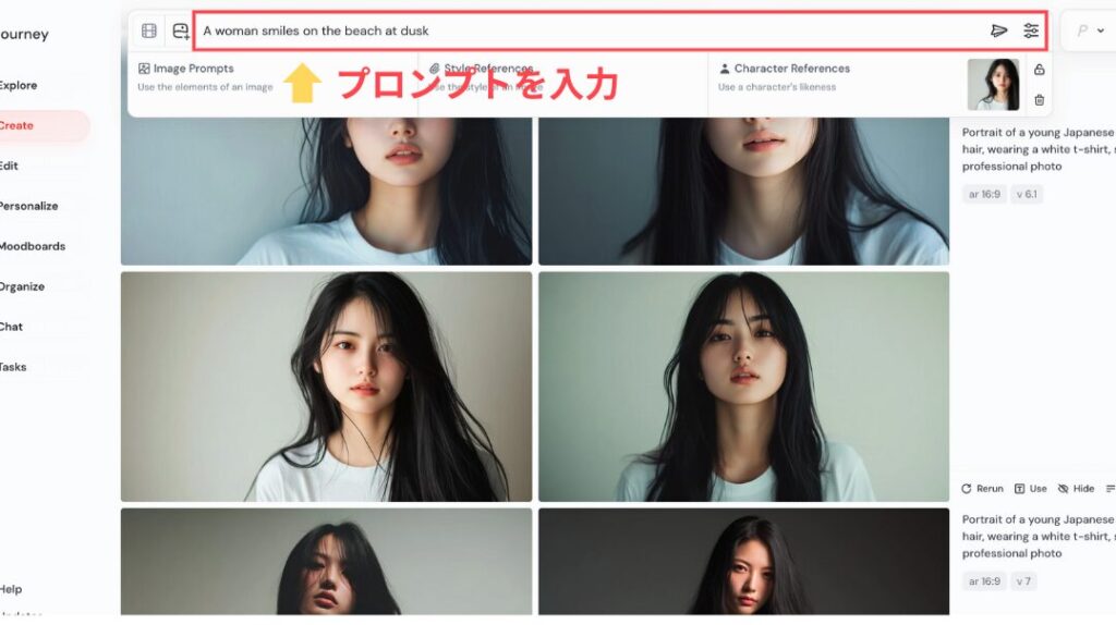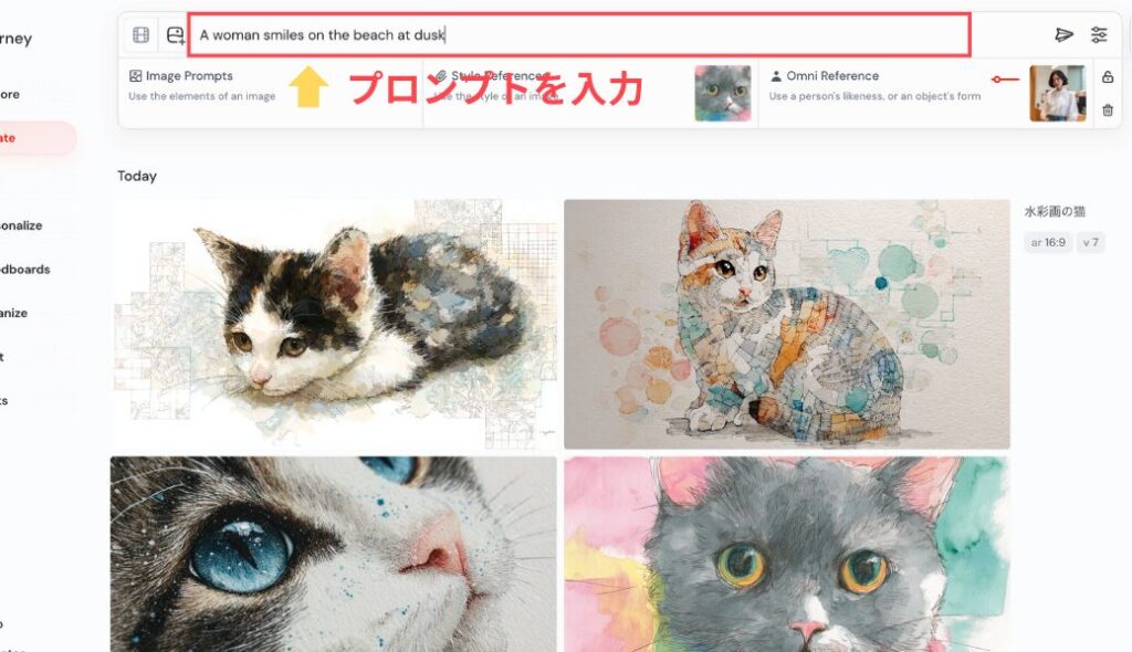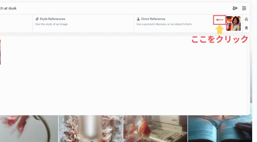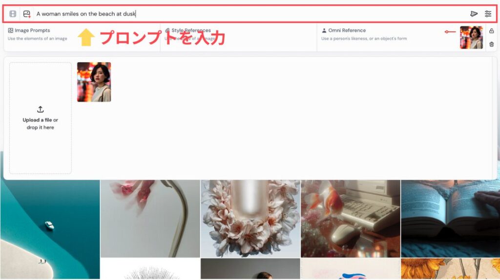 Web版のMidjourneyでオムニリファレンスを使う手順は、とてもシンプルです。