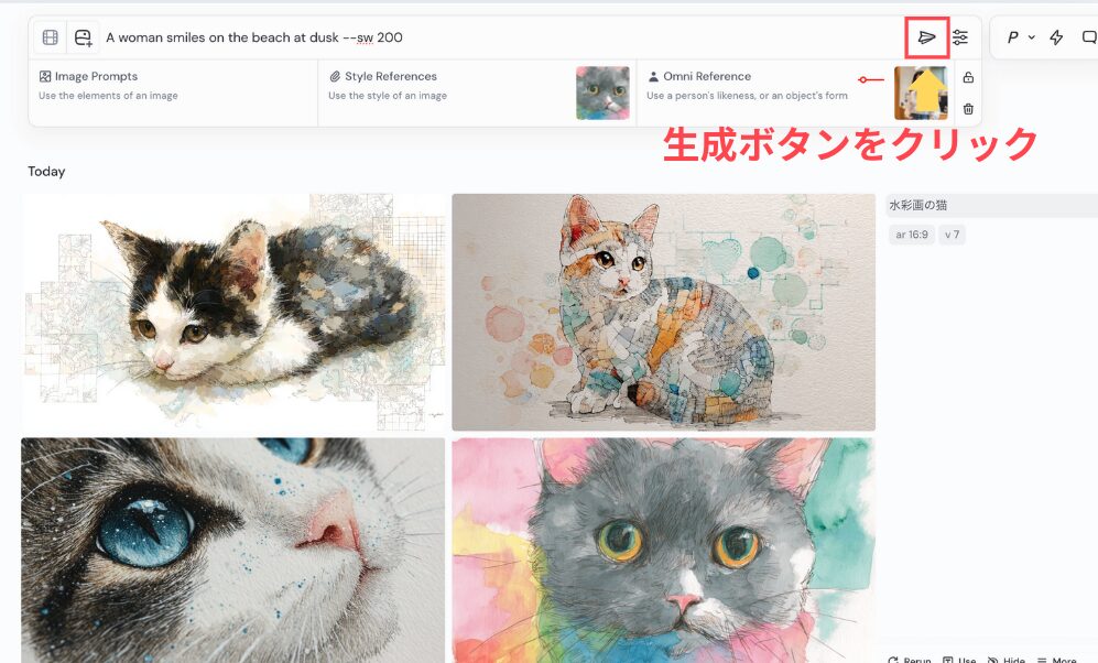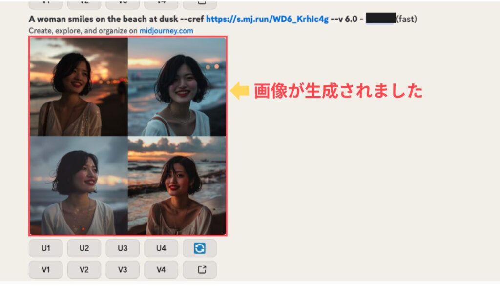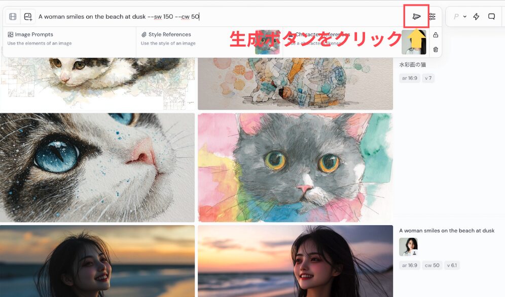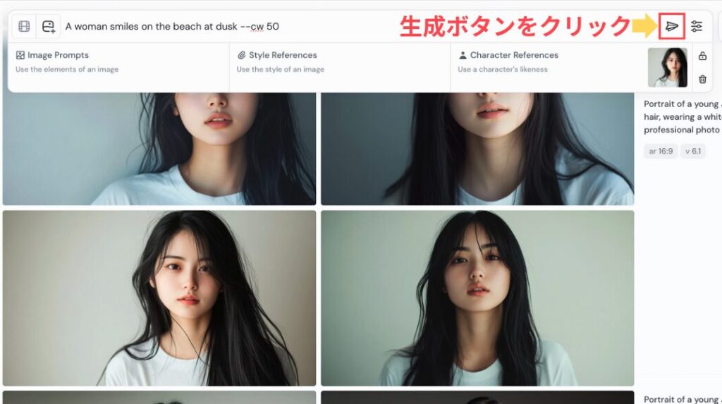 すべての設定が完了したら、Imagine barの右側にある生成ボタンをクリックします。
