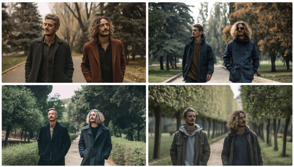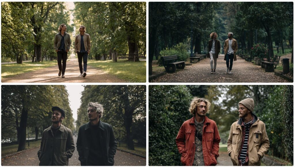 【▼オムニリファレンスで生成された画像(Two men walking in a park)】