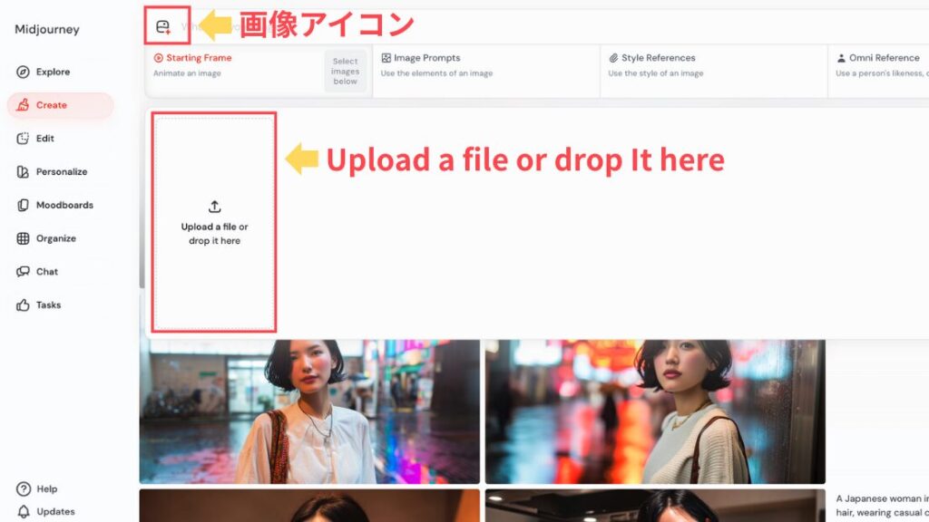 MidjourneyのWeb版にログインし、テキストボックスの左側にある画像アイコンをクリック、「Upload a file or drop It here」をクリックします。ここから、パソコンに保存されている画像をアップロードできます。