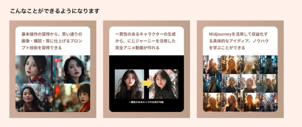 mikimiki webスクールの「画像生成AI・Midjourney完全マスター講座」では、Midjourneyの基礎から実務レベルまで