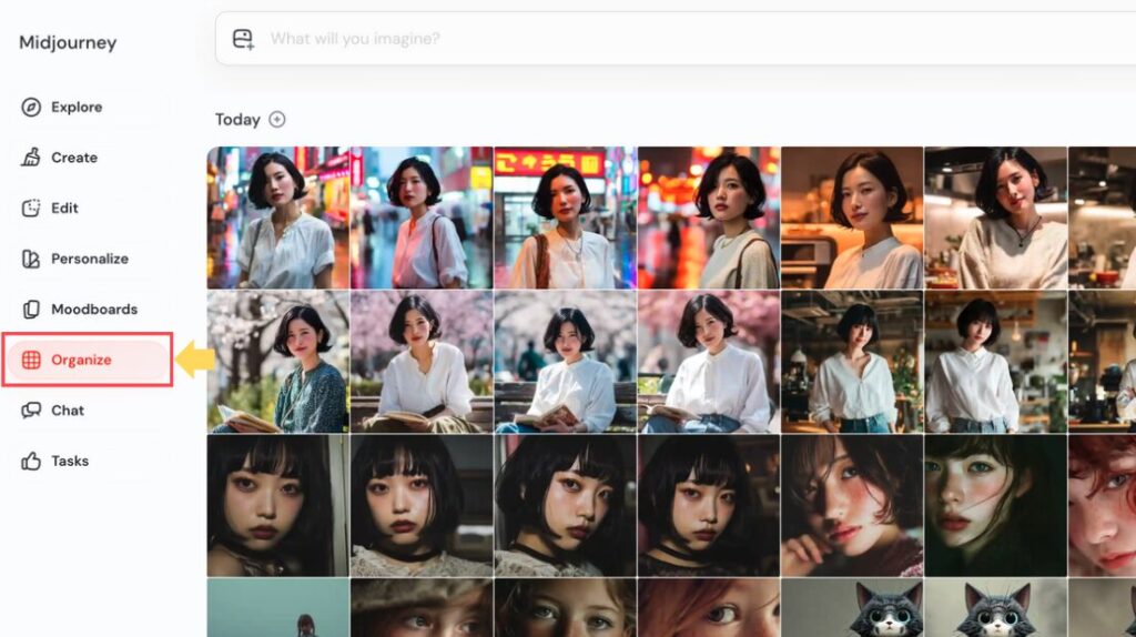 画面左側のメニューから「Organize」をクリックして、過去に生成した画像の一覧を表示します。
