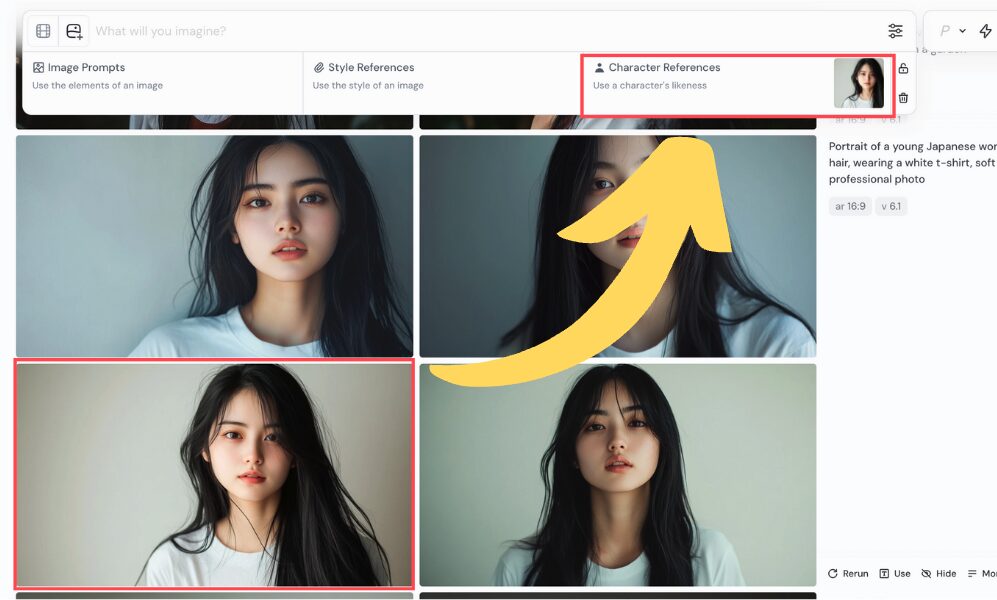 Midjourneyは参照画像を「インスピレーション」として使い、新しい画像を生成しますOK。細かい特徴(ホクロ、アクセサリー、服のロゴなど)は変わってしまうことが多いです。